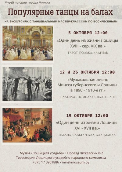 Музыкальной иллюстрацией прозвучат танцевальные произведения Амелии Залуской (1805-1858), дочери дипломата и композитора Михала Клеофаса Огинского, композитора и создателя первого белорусского учебника-самоучителя для пианистов Наполеона Орды (1807-1883). Станет ярким и запоминающимся акцентом экскурсии сочинение минчанина Флориана Миладовского (1819-1889), посвящённое Станиславу Монюшко. «Раскроется» с новой стороны деятельность и музыкальный талант известного белорусского скрипача Михаила Ельского (1831-1904). Завершит «Музыкальный салон в Лошицкой усадьбе» лирическое произведение «поэта фортепиано» Фредерика Шопена (1810-1849), который написал 60 композиций этого любимого бального танца!